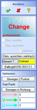 Mit der Funktion "Element ausrichten" können Sie aus PARTsolutions erzeugte Objekte um 180Grad um die Achsen u,v und w verdrehen, bzw in diesen Richtungen mit bestimmten Winkelangaben arbeiten. Des weiteren ist die Verschiebung von einzelnen Objekten in u,v, und w- Richtung unter Längenangabe möglich. Eine Punktpositionierung inkl. Richtungserkennung erleichtert die Arbeit. Wird die Option "mehrfach" aktiviert, können gleichzeitig mehrere Ojekte verschoben werden. Z. Bsp. gesamte Schraubenverbindungen inkl. Bohrungen und Gewinde.