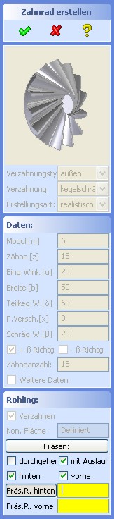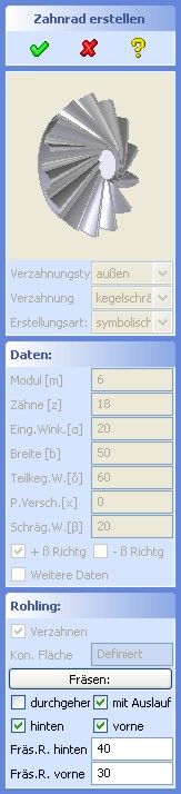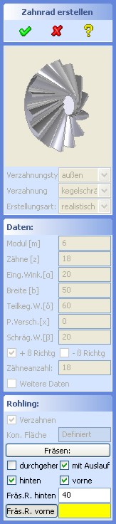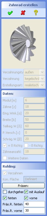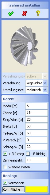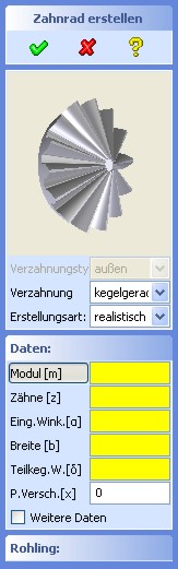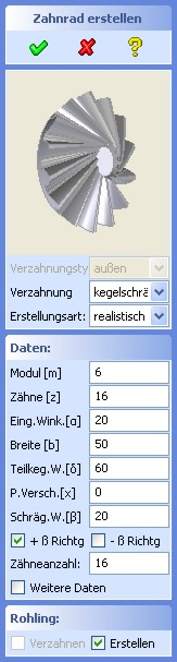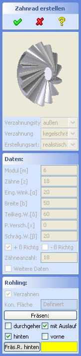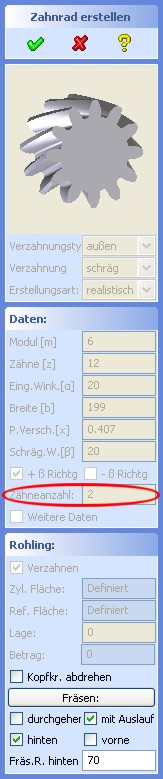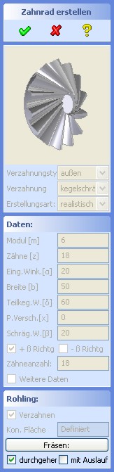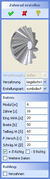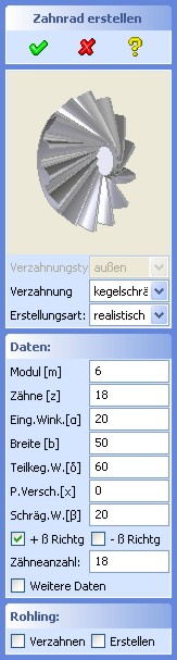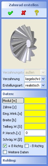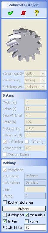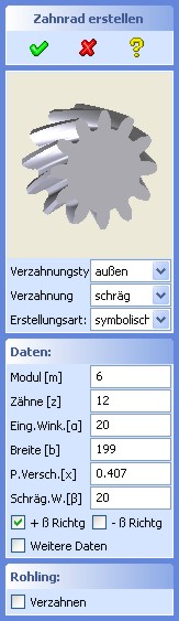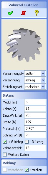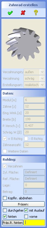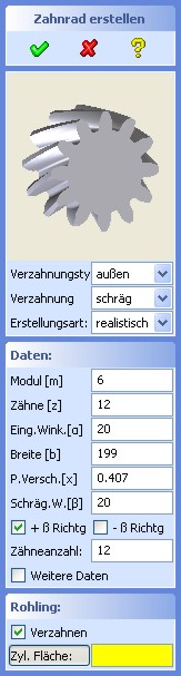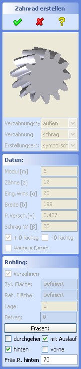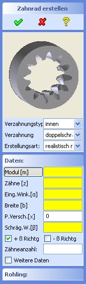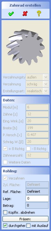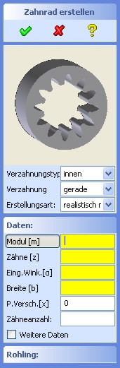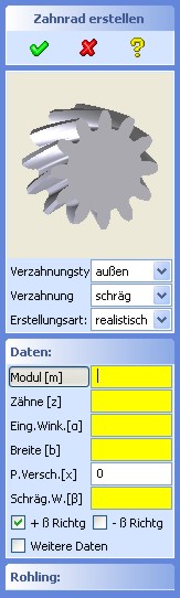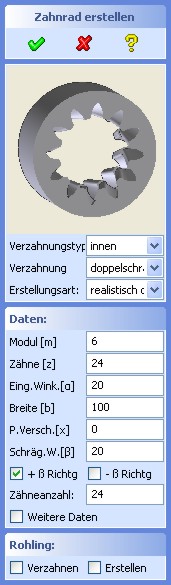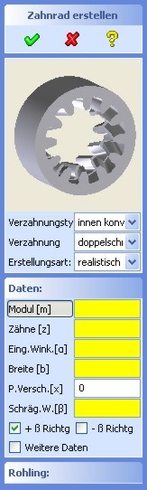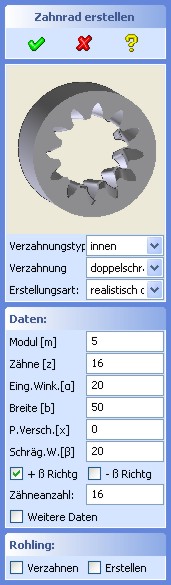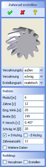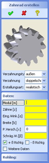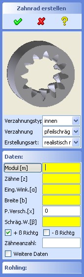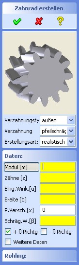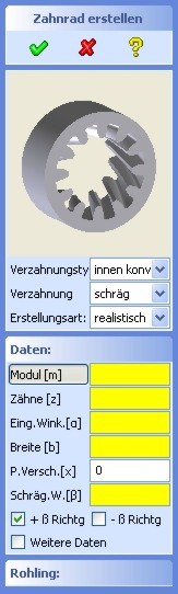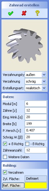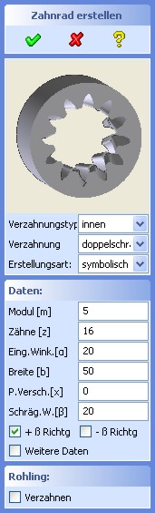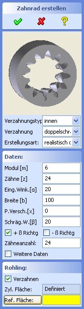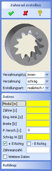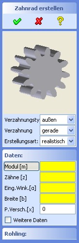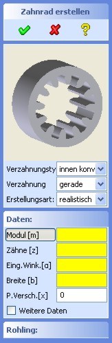 Zahnrad / Verzahnung erstellen Mittels dieses Dialoges "Zahnrad erstellen" können Zahnräder, Verzahnungen und Rohlinge erstellt werden. 2. Der Dialog Zahnrad erstellen und die Verzahnungsarten 4. Erstellen realistisch eines Zahnrads 5. Erstellen symbolisch eines Zahnrads 6. Verzahnen realistisch eines Zahnrads 7. Verzahnen symbolisch eines Zahnrads 8. Verzahnen realistisch und symbolisch eines Zahnrads