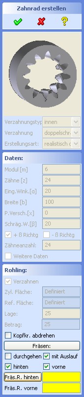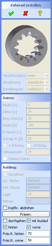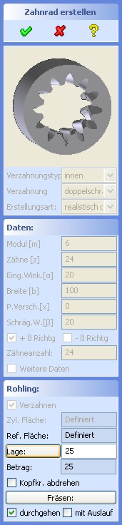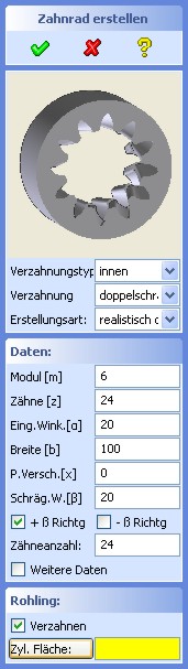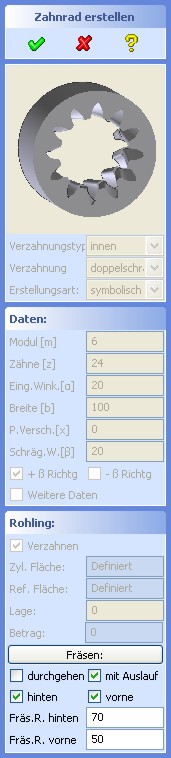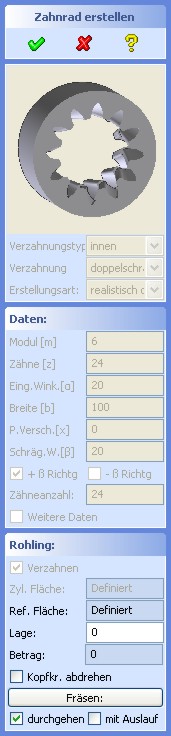 Das definieren der realistischen und symbolischen Verzahnung ist ist in den folgenden Punkten ausführlich beschrieben: "6. Verzahnen realistisch eines Zahnrads" "7. Verzahnen symbolisch eines Zahnrads"
