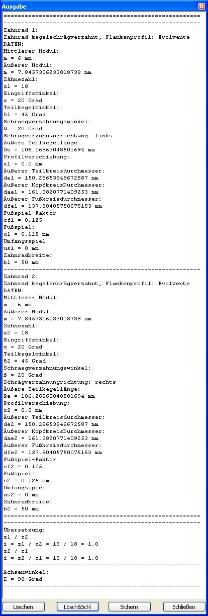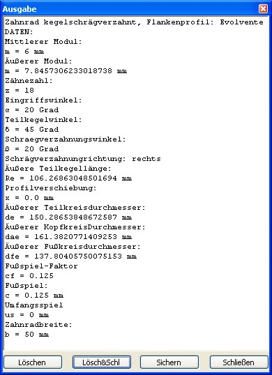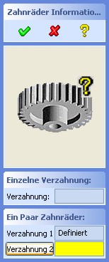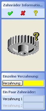 Mittels dieses Dialoges "Zahnräder Informationen" können Verzahnungsdaten eines einzelnen Zahnrads, eines Zahnradpaares abgefragt werden.