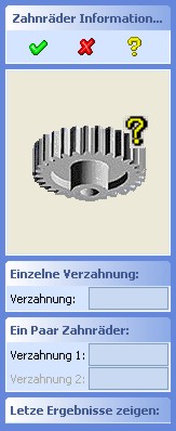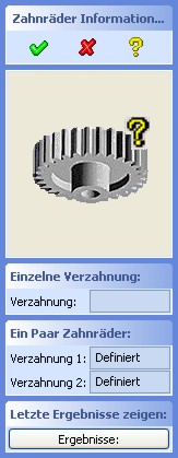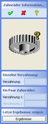 Mittels dieses Dialoges "Zahnräder Informationen" können Verzahnungsdaten eines einzelnen Zahnrads, eines Zahnräderpaares abgefragt werden.