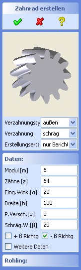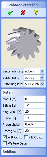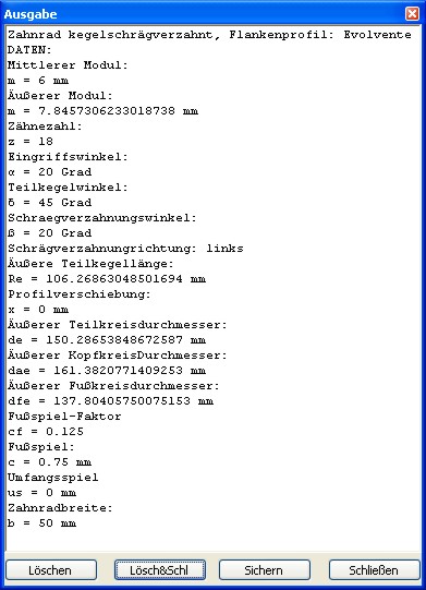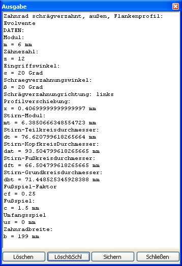 Mittels des Dialoges "Zahnrad erstellen" und der Option "nur Bericht" werden alle relevanten Verzahnungswerte,