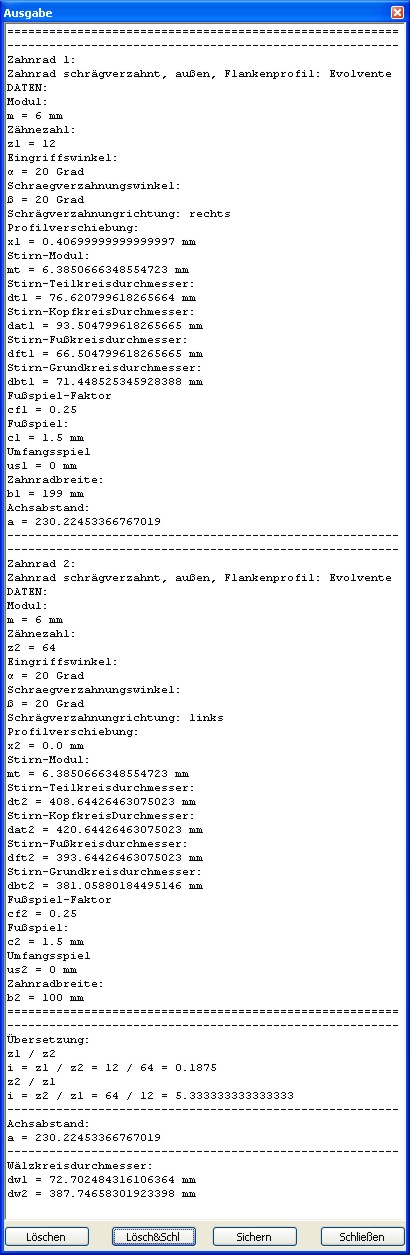 Zusätzlich werden Daten eines, zuletzt erstellten oder berechneten, Zahnradpaares dargestellt.
