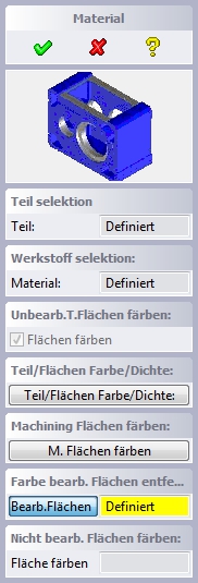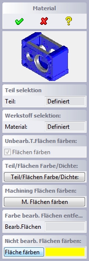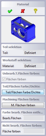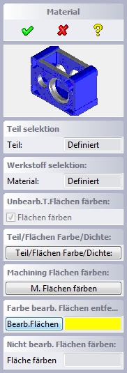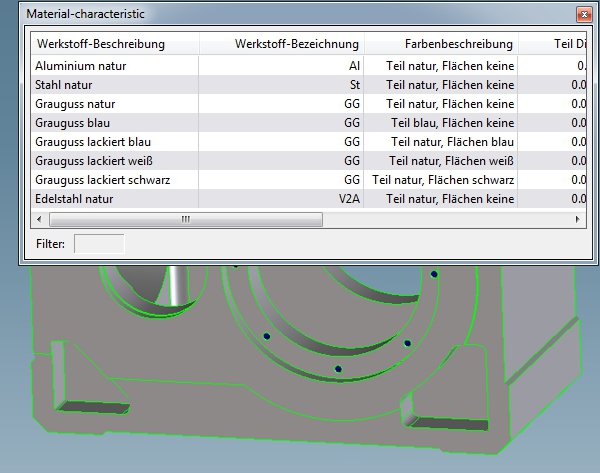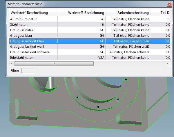 Mittels diese Moduls werden Teilen Werkstoffeigenschaften, wie Farbe und Dichte, hinzugefügt. Die Farbe kann als Teilfarbe oder Teilfarbe und Flächenfarbe definiert werden. Lakierte oder spannend bearbeiteten Flächen sowie Flächen von Features und Gewinden können gesondert und unterschiedlich dargestellt werden. Alle in der Dokumentation dargestellten Inhalte sind nur Beispiele die mit diesem Modul ausgeliefert werden. 1. Dialog und Symbolleiste 2. Beispiel: Setzen der Eigenschaften eine Gußteils 2.1. Teil selektieren 2.2. Eigenschaften wählen 2.3. Teil-, Flächen-Farbe und Dichte setzen 2.4. Farbe der spannend bearbeiteten Fläche setzen 2.5. Ergebnis 2.6. Farbe der nicht spannend bearbeiteten Flächen setzen 2.7. Machining Features Farbe korrigieren 3. Eigenschaftstabelle