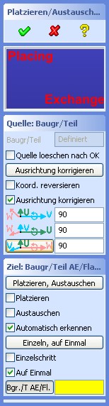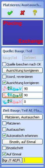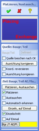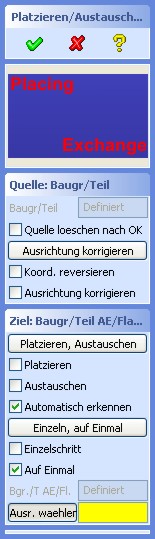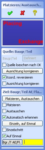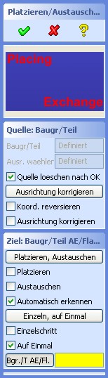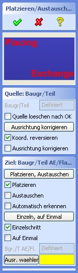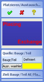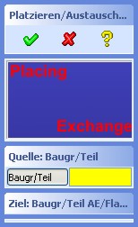 Mittels der gedruckten "Strg" Taste und dem Doppelklick der linken Maustaste auf das hervorgehobenes Element wird dieses Element übernommen und der Dialog "Platzieren/Austauschen" wird gestartet.