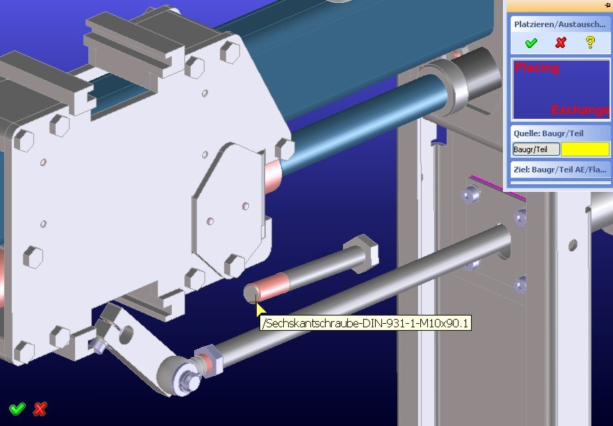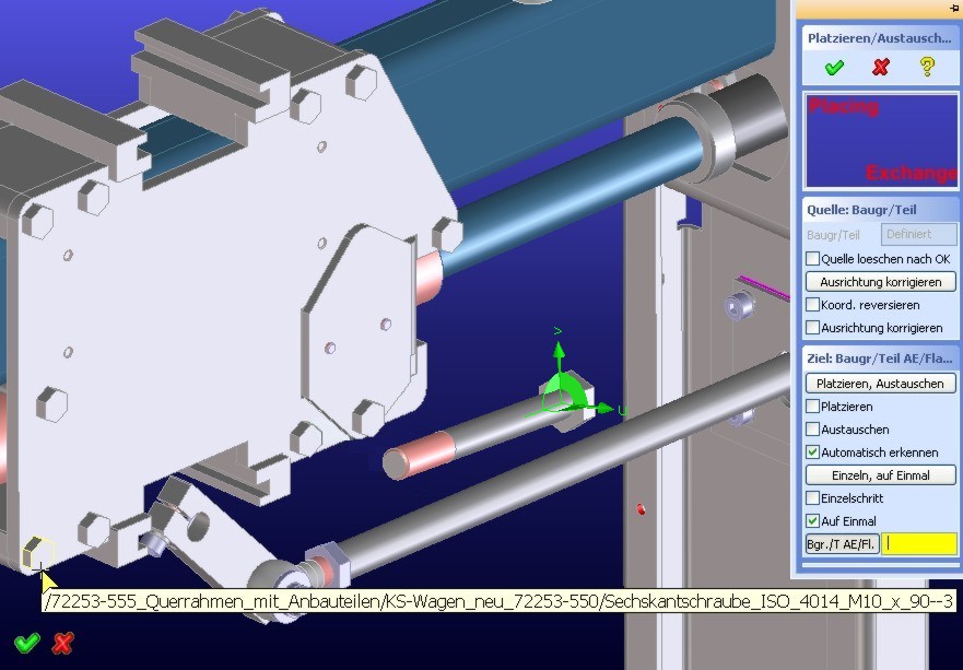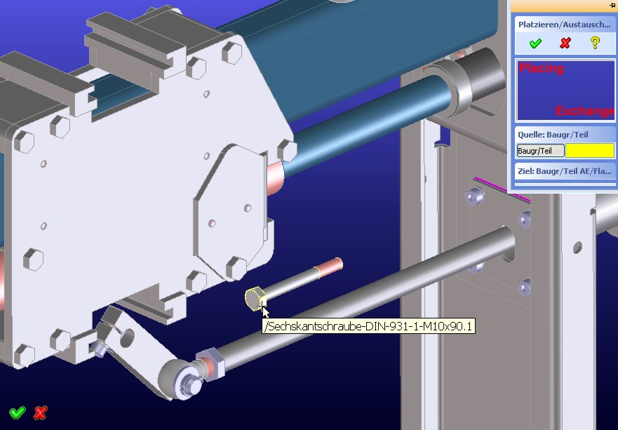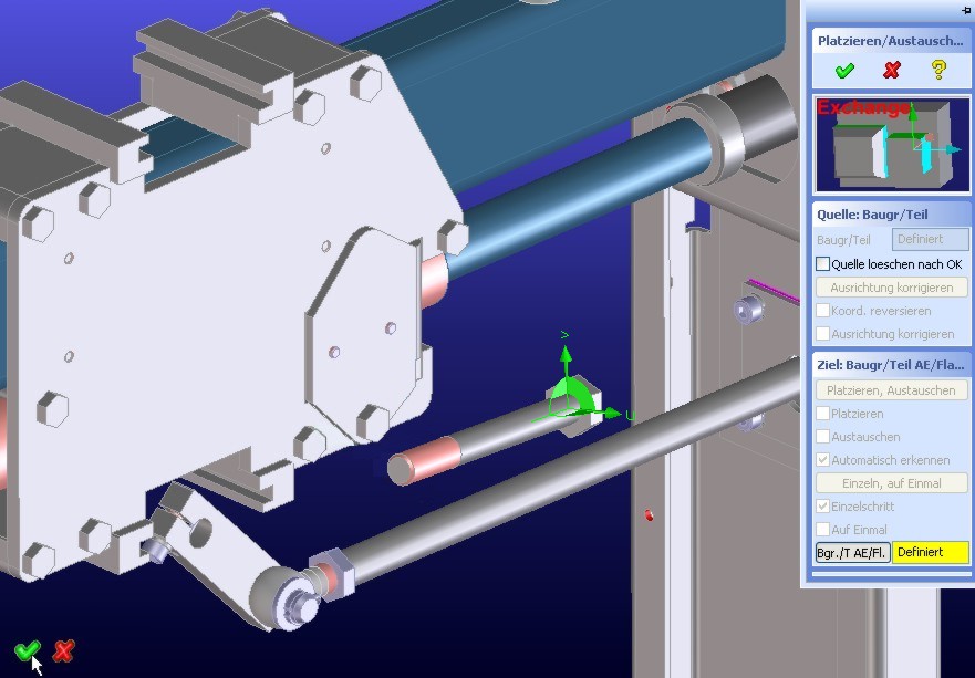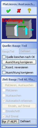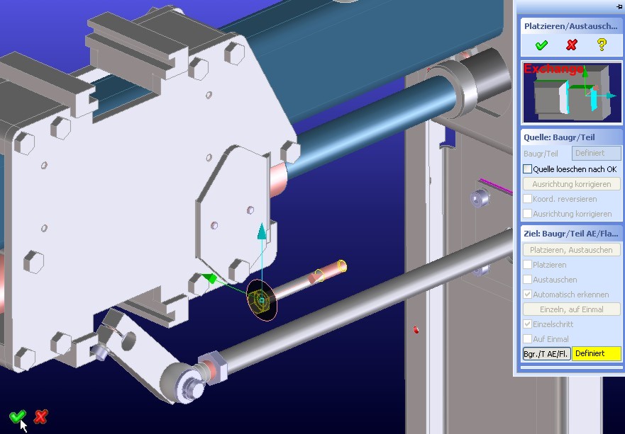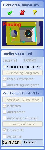 Das Ziel ist ein Objekt: 1. Auf dem eine Quelle platziert wird (Fläche/Arbeitsebene) => Platzieren 2. Das (Teil/Baugruppe) durch die Quelle (Teil/Baugruppe) ersetzt wird => Austauschen