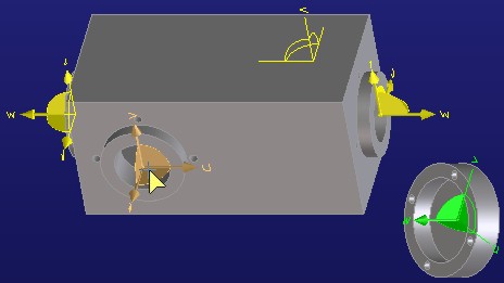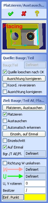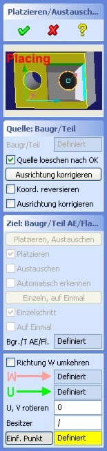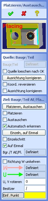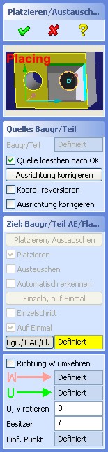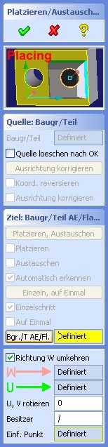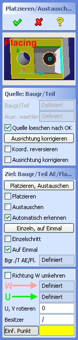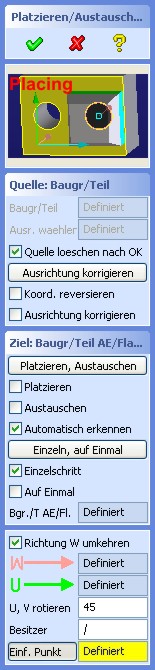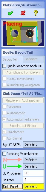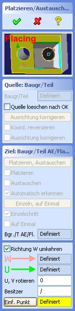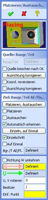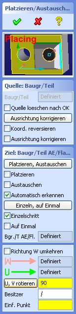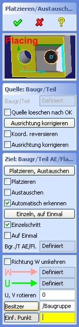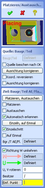 2.2. Das Dialog-Menü "Platzieren/Austauschen" 2.2.3.1. "Platzieren", "Austauschen" oder "Automatisch erkennen" 2.2.3.1.1. Einstellung "Automatisch erkennen" 2.2.3.1.1.1. Eine Kante vom Ziel selektiert 2.2.3.1.1.2. Eine Fläche vom Ziel selektiert 2.2.3.1.2. Einstellung "Platzieren" 2.2.3.1.2.1. Eine Kante vom Ziel selektiert 2.2.3.1.2.2. Eine Fläche vom Ziel selektiert 2.2.3.1.3. Einstellung "Austauschen" 2.2.3.2. "Einzeln" oder "Auf Einmal" siehe auch: 2.4.1. Platzieren "Einzelschritt" 2.4.2. Platzieren "Auf Einmal" 2.2.3.3. Ausrichtung der Quelle korrigieren 2.2.3.4. Ausrichtung des Ziels korrigieren 2.2.3.4.1. Einbauchrichtung W umkehren 2.2.3.4.2. Einbauchrichtung W neu definieren, Richtung U neu definieren 2.2.3.4.3. Richtungen U und V um einen beliebigen Winken drehen 2.3. Wahl einer Ausrichtung bei mehreren Ausrichtungen von Quelle oder Ziel 2.4.1. Platzieren "Einzelschritt" 2.4.2. Platzieren "Auf Einmal" 2.4.3. Platzieren auf Arbeitsebenen 2.6. Informationen und verfügbare Funktion in dem Strukturbaum